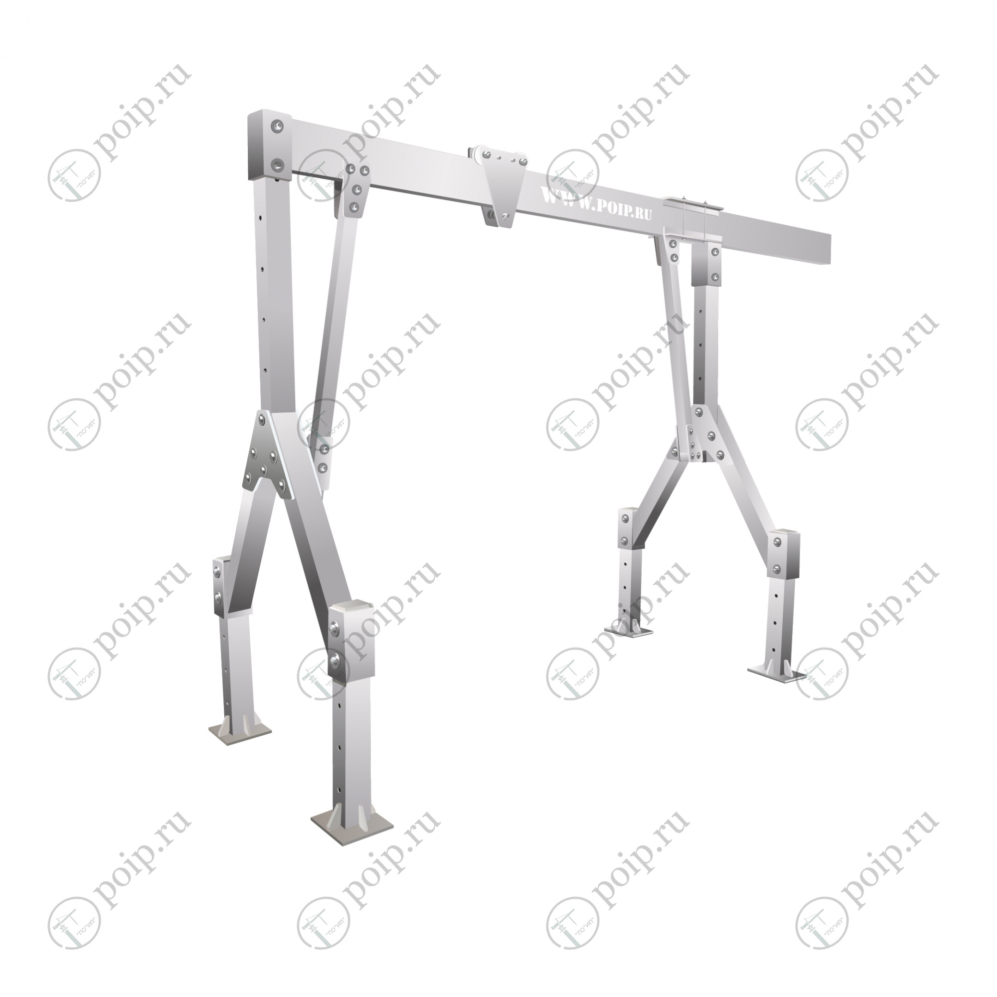 Особенности конструкции: регулируется по высоте для использования в помещениях с различными высотами потолка; регулируется по ширине пролета для возможности использования в ограниченных местах. Изделие состоит из несущей балки коробчатого профиля, двух складные Λ-образные несущие опор, двух регулируемых по высоте стоек, крепления регулятора по ширине, четырех регулируемых опор, холостой каретки для передвижения тали.